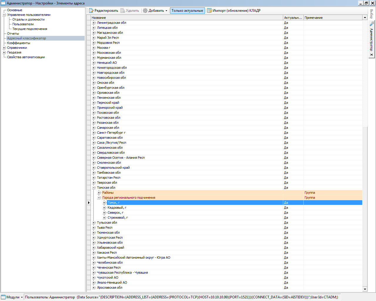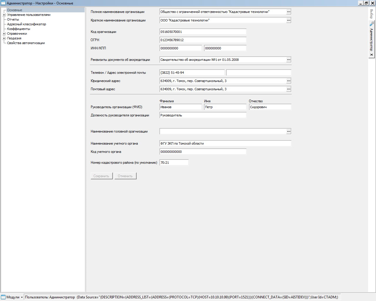 Ввод адресной информации осуществляется с использованием классификатора адресов России (КЛАДР).