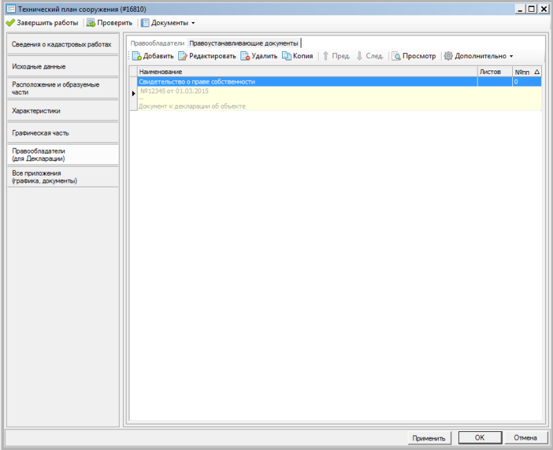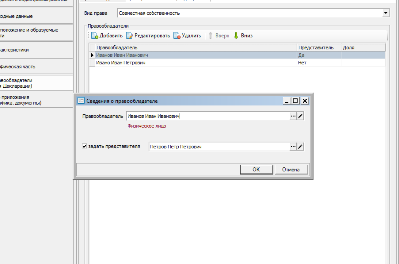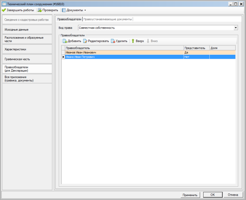 Для объектов модуля «Технический план» добавлена возможность задавать список собственников. Данные сведения используются для формирования декларации об объекте недвижимости.